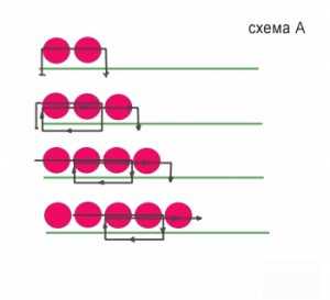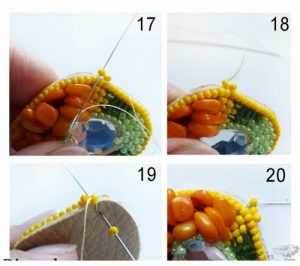 Обшейте согласно предложенной схеме стразу бисером салатового цвета в одну полосу. Затем пришейте желтый бисер по выделенному краю изделия. Это необходимо для того, чтобы во время рабочего процесса вы не выходили за край.