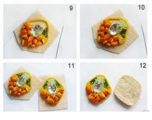 Так как в любом случае между перламутрами останутся небольшие пробелы, вы можете заполнить их бисером бордового цвета. Нитку фиксируйте с другой стороны. Далее пережодите к желтому бисеру, пришейте его, а потом и зеленый. Поверху пустите бисерины салатового цвета, а затем снова желтые. Нитку закрепите с изнаночной стороны и обрежьте.