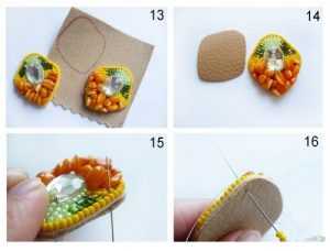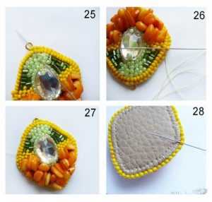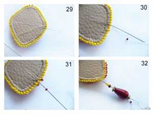 Теперь вырежьте такие же формы из кожзама. Вставьте иглу между фетром и кожезаменителем. С изнанки проколите изделие, а иголку выведите через два ряда бисерин. Узел сделайте с изнанки так, чтобы он оказался между материей и коже заменителем.