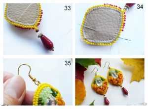 Внизу изделие можно украсить дополнительной бордовой бусиной. На фото показан процесс выполнения. Такие действия будут понятны даже новичкам. В самом конце вам останется закрепить в швензу специальный крючок, который потом вставляется в уши.