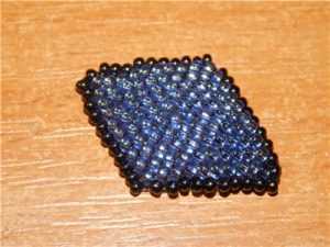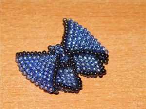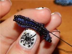 Второй элемент плетите аналогичным способом. Чтобы изготовить хвостики изделия, вам необходимо набрать на нить стекляшки в следующей последовательности: одна штучка темного цвета, девять штук должны быть светло – синего и еще две черного. Расположите все главные элементы в центре основного материала и плетите ромб, только меньшего размера. Вы должны сделать такие две заготовки.
