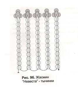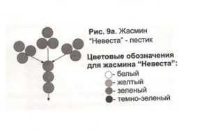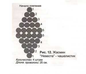 Схем плетения будет достаточно, чтобы вы смогли сделать поделку, как можно правильнее и быстрее. Начинаем работу с распустившихся цветов. Для 1 бутона нужно сделать четыре лепестка, каждый из которых будет состоять из двух половинок. Сперва изготовьте два экземпляра. Первую половинку плетите светлыми бусинами на отрезке проволоки протяженностью сорок сантиметров. Далее протяните отрезок между двумя линиями основной половины растения. Аналогичные действия повторите и со второй половинкой. Еще одна пара жасминовых лепестков будет делаться точно также.