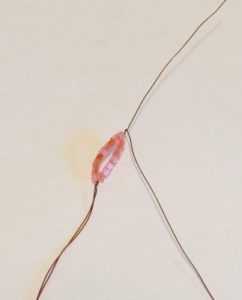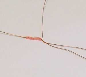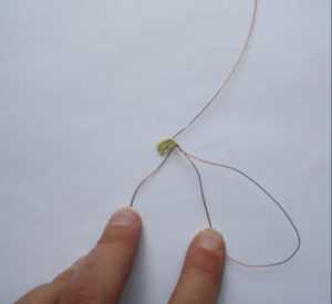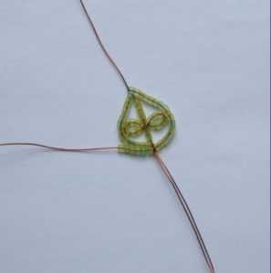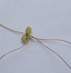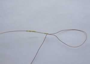 Первым делом вам необходимо скрутить на проволоке большую петлицу, у которой должны торчать два хвостика, один семь сантиметров, а другой семьдесят сантиметров. Сперва нужно работать с коротким концом, на который нанизывают шесть бисерин, а потом наберите на длинный – девять бисерин. После этого прикрепите заготовку к основному материалу, как изображено на фото.