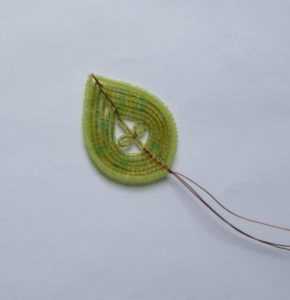 Затем, как вы проводили манипуляции с лепесточками, формируйте дуги вокруг серединки листика. Их должно быть 4 шт. Последняя дуга плетется из матового изумрудного бисера.
