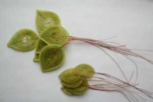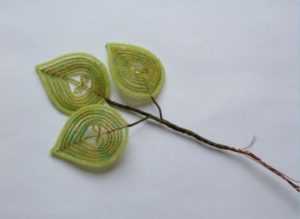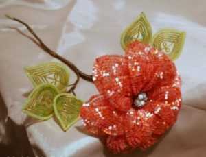 Какой же цветок без листвы. Теперь необходимо сделать листочки изумрудным бисером. Техника плетения практически одинакова с плетением самого цветка. Вам нужно оставить петлицу таким образом, чтобы от нее отходило два конца различной длины. На короткий край наберите восемь штучек, из них отделите шесть бисерин и скрутите петельку, которая должна приделываться к основному каркасу.