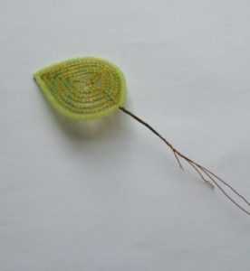 Осталось только собрать цветок воедино. Отрежьте тридцать сантиметров толстой проволочки, затем прикрутите ее к тонкой, чтобы объединить все края заготовок. Вы должны делать это аккуратными движениями, чтобы изделие было максимально ровным. Первый листик нужно прикрутить под самый бутон. Затем с остальными сделайте тоже самое.