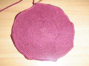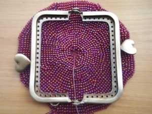 Теперь можно приступать к круговому вязанию самого кошелька до необходимой высоты. Чтобы получить эффект мешковины в кошельке, вам нужно, как можно больше нанизывать бисер. Тогда окружность бисерной заготовки намного превысит окружность металлического фермуара. Когда необходимый масштаб будет достигнут, провяжите от 2 до 4 окружностей не делая прибавления для увеличения. Далее выполняйте сужение заготовки наоборот. После этого выполните примерку изделия, раскрывши фермуар в полном объеме.
