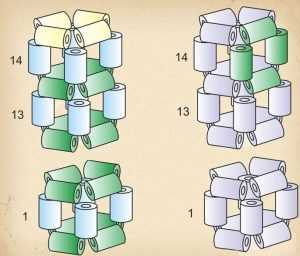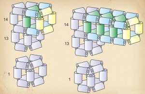 Сам процесс изготовления начинают с пятнадцати квадратиков. Не стоит забывать о том, что леска должна быть хорошо натянута, а столбики должны быть тугими, а не наоборот. После того, как вы сделаете столбец из четырнадцати квадратиков, необходимо сформировать прямой уголок. Стороны поделки должны иметь равные размеры, а соединение их должно происходить с помощью общих кубиков.