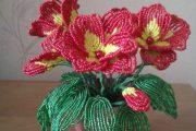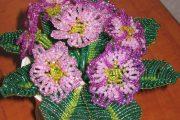 Заключительным шагом станет сборка всех деталей цветка примулы из бисера. Собираем цветок, состоящий из шести лепесточков, расположенных по кругу относительно сердцевинки. Сердцевину можно сформировать из четырех бусинок, нанизанных на небольшие проволочные отрезки. Присоединяем цветок к более прочному отрезку проволоки и обматываем его зелеными нитями или флористической лентой.