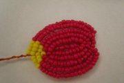 Для обрамления лепесточка необходимо взять отрезок проволочки и продеть его сквозь три бисеринки желтого цвета, находящиеся с края по направлению снизу вверх, нанизать одиннадцать цветных бисеринок и продеть проволочный отрезок сквозь центральную бисеринку самой первой петельки, как на схеме № 6. Далее нанизываем еще две бисерины и проводим проволочку далее сквозь следующую верхушку второй петельки. Таким образом, ориентируясь по схеме закончите обрамление всего лепесточка.