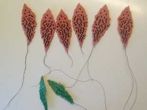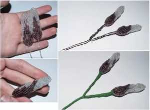 Лилия из бисера имеет в составе не только лепестки, но и зеленые листья, которые следует плести в той же технике параллельного плетения. Выполняют листья при помощи двух оттенков зеленого бисера. Схема количественного состава для бисера по рядам следующая: 1-3-4-4-5-6-6-7-8-8-9-11-11-9-9-7-7-6-5-4-3-2-1. Кроме лепестков и листьев, необходимо изготовить несколько тычинок, чтобы сделать цветок законченным.