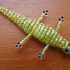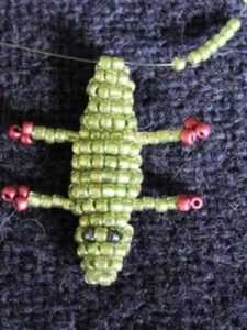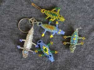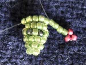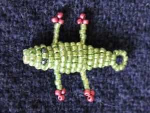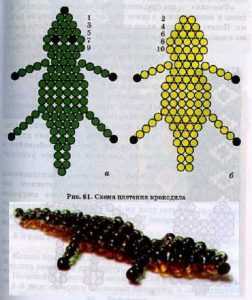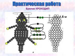 Дойдя до седьмой полосы, замените две основные зеленые бусины на столько же черных, так как это будут глаза. Лапы хищника крокодильчика плетут не отрываясь от процесса, то есть по ходу следования туловища. После тринадцатого р. наберите по пять бисерин по краям и пройдитесь леской сквозь четыре, только в противоположном направлении. Не забывайте подтягивать леску. Задние лапы формируют аналогичным образом. В самом конце хвоста следует сплести петлю простой цепочкой, так как это тоже будет брелок, как и в предыдущем варианте.