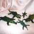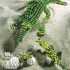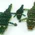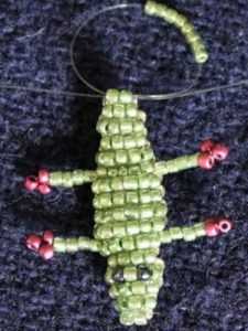 После того, как вы сделаете своими руками голову рептилии, можете начинать плести лапки. Нанизывайте на один край основного материала четыре зеленые бисерины и три штучки другого цвета. Пропускайте леску сквозь зеленые стекляшки. Затяните потуже так, чтобы не осталось свободного места между лапой и тельцем крокодила. Аналогичные действия необходимо повторить и со второй лапкой, как показано на фото.