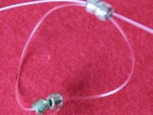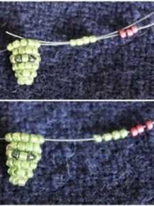 Возьмите отрез лески и наберите на него 2 бисерины зеленого цвета, а затем расположите их по центру, как показано на фото. Теперь необходимо пропустить сквозь стекляшки второй кончик основного материала и сформировать петлицу. Затягивайте петельку и сделайте повтор так, чтобы бисер находился по центру.
