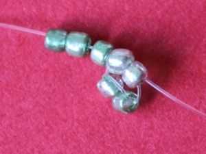 Далее наберите еще 2 стекляшки, только желтого оттенка, ну или светло – изумрудного. Снова сделайте петельку и затяните ее.