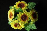 Прикрепляем к стержню листочки, распределяя их по обеим сторонам, на небольшом расстоянии друг от друга. Обматываем нитками, при необходимости, места крепления деталей. Наш подсолнух из бисера готов, теперь его можно поставить в вазочку из или объединить в букет с другими цветами.