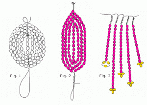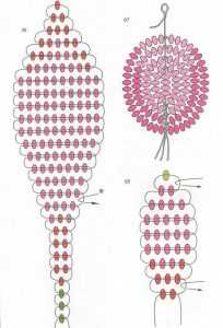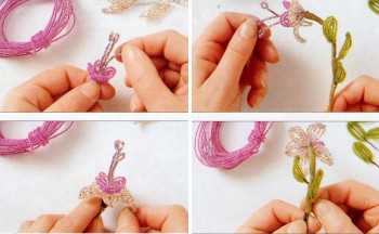 Для тычинок используйте серебристо-розовые бисерины и сделайте их в самой верхней части на тычинке. Каждый бутон фуксии должен иметь три или четыре тычинки, у которых высота будет разной. В конце нужно скрутить проволочку возле основания. Готовые тычинки следует поместить в центр чашечки и закрепить оборотом проволочки. Под этой чашечкой крепят пять внешних лепесточков и расправляют их своими руками, придавая правильную и красивую форму. Зеленая листва также плетется способом закручивания бисерных дуг. Поэтому, после того, как все будет сделано, прикрепите листочки также к стеблю и обмотайте лентой для флористики.