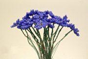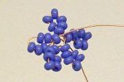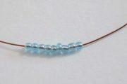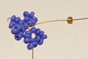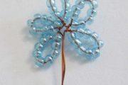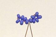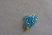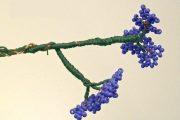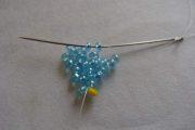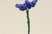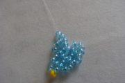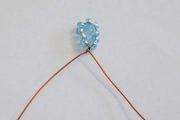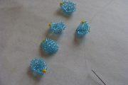 Отрезаем проволоку примерно в 20 см длиной и набираем на неё, не отводя далеко от края, 9 голубых бисерин. Скручиваем в петлю – маленький листочек будущего цветка. Повторяем так ещё 4 раза и получаем 5 одинаковых листочков, которые сводим вместе и скручиваем. Концы уводим вниз, но пока не скручиваем – ещё тычинки нужно сделать. Таких цветочков можно сделать сколько угодно – 10 или 15, а то и все 30 штук.