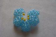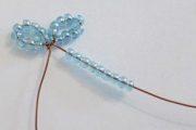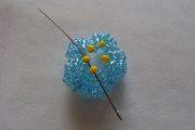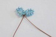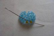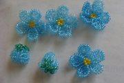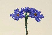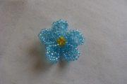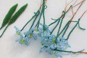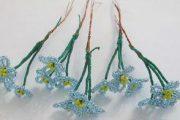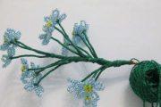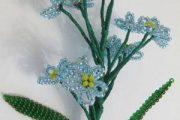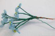 Цветки бисерных незабудок плетутся следующим образом: на проволоку нанизывается бисерин 6 голубого цвета, кончик проволоки вдевают в первую из набранных бисерин и «кольцо» замыкают. Получаем цветочек, в центр которого нужно сделать тычинку: на другую проволочку нанизываем жёлтые бисеринки 1-2 шт. и помещаем в центре незабудки. Далее скручиваем проволочки в стеблёк и делаем следующий цветочек. Можно сделать их разных голубых оттенков: просто голубых, светло-голубых и несколько розовых цветков.