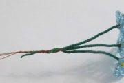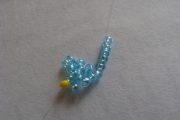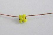 Потом, также на проволоку в 10 см длиной набираем 4 бисеринки жёлтого цвета. Любой из концов проволоки пропускаем через 2 бисерины в обратном направлении и затягиваем концы проволоки – получилась тычинка, которую нужно вставить в середину цветка. Концы всех проволочек хорошенько скручиваются вместе.