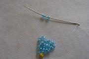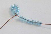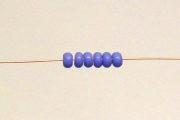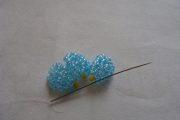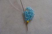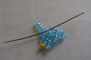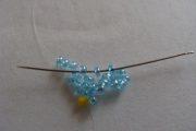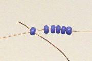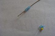 Набираем снова 5 бисерин (только теперь все голубые), а иглу выводим в ту, из которой в прошлый раз она выходила и следом выводим ее и через соседнюю бисеринку, натянув предварительно леску.