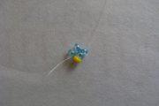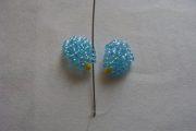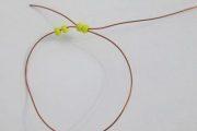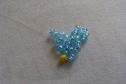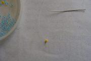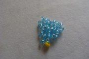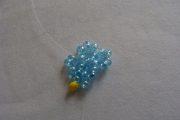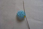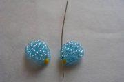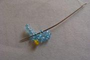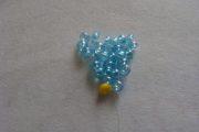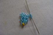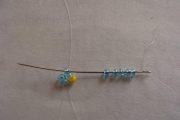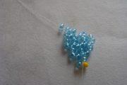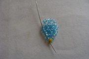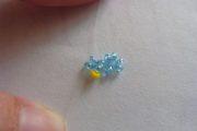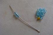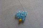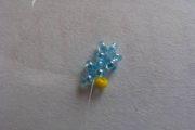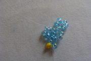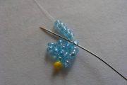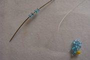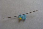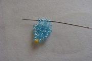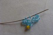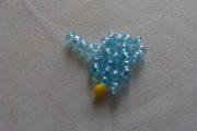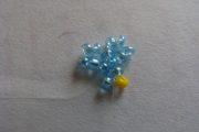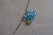 Начинаем плести первый лепесток с подготовки лески, на которую будем нанизывать бисеринки. Отрезаем 25 см. лески, на один ее кончик вдеваем иглу, набираем одну желтую бисеринку и тянем к другому краю, завязав предварительно на конце два узла. Добавляем 4 бисеринки голубого цвета, натягиваем леску и замыкаем кольцо, проведя иглу между 2-мя голубыми.