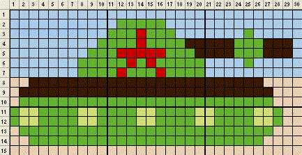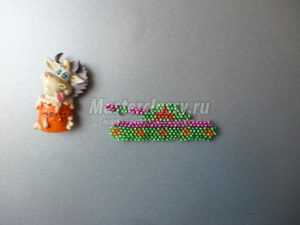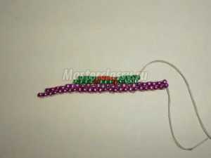 В третьем и четвертом ряду следует сделать расширение. Сплетите полосу согласно схемы, далее наберите последнюю стекляшку зеленого цвета и спустите ее иголкой в последний элемент третьего р. После этого пройдитесь в предпоследний элемент и поднимитесь к 4-у р., пройдя иголкой в два последних бисера. В итоге у вас закончен теперь и 4- й р.