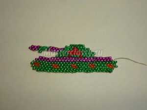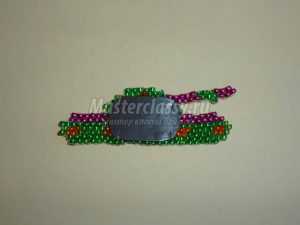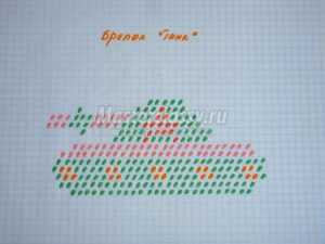 Далее начинайте плести следующий ряд. Сперва выполните уменьшение на 1 элемент. Затем наберите на нитку бисер того цвета, который был и перед этим, пройдитесь иглой под нитью, соединяющей 2-ую и 3-ю бисерину в первой полосе. После этого выходите обратно сквозь нанизанную стекляшку. Вам необходимо плести поделку в виде этой военной техники, постоянно сверяясь с представленным рисунком. Теперь вторая полоса также готова.