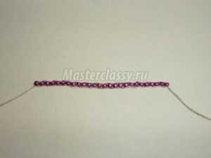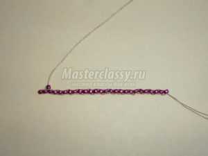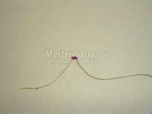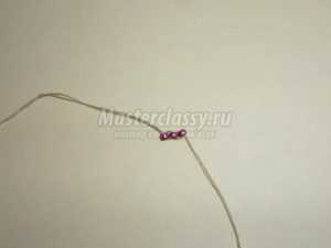 Возьмите нитку с иголкой, а на конце сделайте небольшой узелок. После этого наберите две бисерины фиолетового цвета, и пройдитесь иголкой в первую из них, а потом и во вторую, чтобы у вас образовалась петлица, как показано на фото. Далее прибавьте следующий элемент точно такого же цвета и пройдитесь основным материалом во второй бисер и выведите нить в третьем элементе.