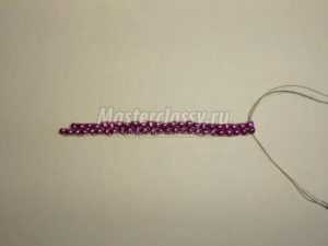 Продолжайте плести целый ряд, добавляя каждый раз по одному фиолетовому бисера. У вас должна получиться такая заготовка, как показано на фото.