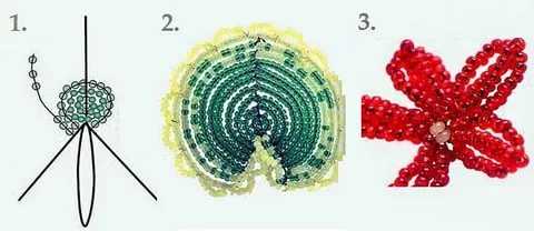 Это был сделан лист небольшого размера, который потом будет располагаться в верхней части стебелька герани, а снизу вы прикрепите листву большего размера. Бисероплетение осуществляется аналогично, только вам необходимо увеличить численность оборотов из зеленых стекляшек от семи штук до двенадцати.