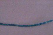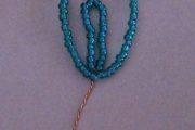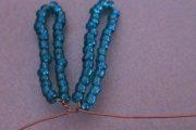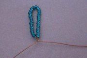 На отрезок проволочки в шестьдесят сантиметров нанизываем тридцать одну бисерину зеленого цвета. На расстоянии пяти сантиметров от конца проволочки формируем бисерную петлю. Далее, нам необходимо нанизать бисерины, воспользовавшись длинным кончиком проволочки и сделать еще одну петлю.