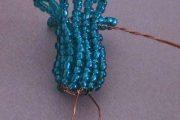 Для плетения малых чашелистиков воспользуемся отрезком проволочки в двадцать семь сантиметров. Формируем на кончике проволочки петельку. На ось длинной четыре сантиметра нанизываем пять бисеринок зеленого цвета. Далее на рабочую проволочку нанизываем зеленый бисер и создаем ею четыре дуги в два витка. Всего делаем три таких чашелистика.