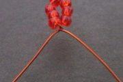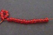 Для начала, приготовим отрезок проволочки в двадцать девять сантиметров в длину, на который необходимо будет нанизать семь бисеринок красного цвета. На расстоянии пяти сантиметров от конца проволоки формируем петлю. Теперь на длинный кончик проволочки нужно нанизать такое количество бисеринок, которое позволит сделать дугу над нашей петелькой, как на фото: