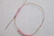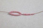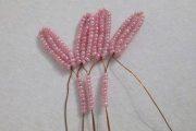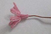 Взяв шесть лепестков и тычинку, начинаем соединять их. Для этого на правый кончик проволоки лепестка надеваем 8-9 бисеринок. После этого левую проволочку следующего лепестка проводим через эти бисерины. Таким образом, мы их соединяем. На, оставшийся свободным, правый кончик второго лепестка надеваем столько же бисеринок и прикрепляем к нему третий. Соединив в цепочку 6 лепесточков, замыкаем ее, проводя левую проволочку первого лепестка через бисер, одетый на правый кончик шестого. Затем прижимаем бисеринки вплотную к лепесткам и плотно скручиваем проволочку на 4-5 оборотов.