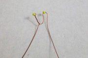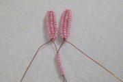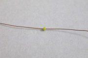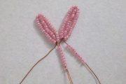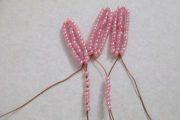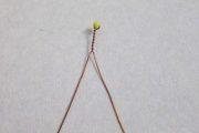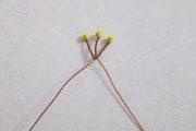 Следующим, что нужно сделать – изготовить тычинки для цветочков. Это очень просто. На проволоку длиной 25 см одевается одна желтая бисерина. Под ней проволока скручивается на длину 0,5-1 см. Далее на левый конец одевается еще одна бисерина и отгибается вровень с первой. После, сложившаяся под ней вдвойне, основа для плетения скручивается на такую же длину. С правым концом проделывается то же самое. В результате получаются 3 тычинки. Их следует изготовить для каждого цветочка.