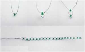 Первым делом начинаем плести веточки ивы. Отрежьте леску протяженностью тридцать сантиметров. По центру отрезка необходимо расположить одну бусину. Далее протяните любой конец проволоки сквозь изумрудный элемент, чтобы вышла петелька. Потом нанизывайте еще бисерину, а сквозь нее протяните другой край лески, также с образованием петлицы. Посмотрите на фото, у вас должен получиться аналогичный круг. Следите за тем, чтобы его диаметр не превышал одного сантиметра. Лучше пусть будет меньшего диаметра. За счет этого плакучая ива из бисера будет смотреться намного пышнее.