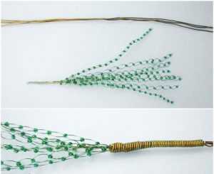 В таком порядке следует заполнить проволоку по одной штучке до того момента, пока у вас не останется четыре сантиметра до конца отрезка. По завершению плетения, скрутите остаточный материал внизу. Чтобы дерево смотрелось красиво, постарайтесь выполнить бисероплетение сорока веток. Для более усидчивых мастериц рекомендуем сделать даже больше. Края каждых восьми заготовок необходимо соединить друг с другом, как показано на фото.