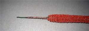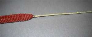 Подготовленную заготовку отложите в сторону и сделайте на проволочном отрезке низку из бисерин выбранного оттенка протяженностью от полутора до двух метров. Далее, вам следует аккуратно последовательно обмотать данной низкой всю подготовленную поверхность для будущего камыша. Кончик проволочки при этом фиксируется на вершине изделия.