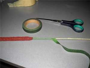 Вершина, а также стебель обматываются при помощи строительного скотча, поверх которого уже наматывают тейп ленту. Для верхушки используют коричневый оттенок ленты, а для стебля – зеленый.