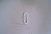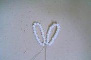 Отматываем отрезок, длиной около 50 см, нанизываем на него непарное число бусинок белого цвета, количество зависит от желаемой величины будущей ромашки. Из набранного бисера формируем петельку, скручивая несколько раз. Возле лепестка, с одной стороны должен остаться отрезок проволоки длиной 5-6 см. На длинный конец, нанизываем аналогичное количество бисера и формируем следующий лепесток. Лепестки должны плотно прилегать. Таким образом, изготавливаем нужное количество, далее замыкаем их в окружность, скручивая оставшиеся концы проволоки вместе. Это заготовка под ромашку из бисера, с пустой серединкой.