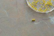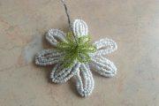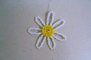 Для центральной детали цветка, понадобится небольшой отрезок проволоки (15-20 см) и желтый бисер. На конце проволоки петлей закрепляем одну бусинку, чтобы не сползали остальные. Для серединки набираем 25 бисерин, плотно их сдвигаем и закрепляем последнюю. Формируем заготовку в виде спирали, аккуратно помещаем ее в центр детали с лепестками и закрепляем. Ромашка из бисера готова, посмотрите на фото как она изысканно смотрится.