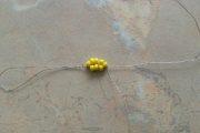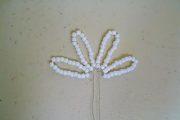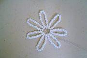 Для первого лепестка, на проволоку набирается парное количество бусин, например 30. Бисер изгибается в петлю, вытянутой формы. На свободный длинный конец нанизывается половина количества бусин (15), проволока закрепляется в верхней части петли, точно посередине. Далее – снова набирается 15 бусин, а конец закрепляется в нижней части петли. Полученная заготовка, из 4 рядов бусин, будет первым лепестком ромашки из бисера. Остальные лепестки изготавливаются так же. Когда их количество достигает нужного, заготовка замыкается в кольцо, концы скручиваются между собой.