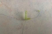 Чтобы цветки хорошо держали форму, к ним надо сделать чашелистики. Для этого, на отрезок проволоки набирается несколько десятков бусин, и простыми скручиваниями формируются петельки. Свободные концы плетения соединяются между собой.