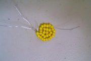 Чтобы сплести серединку цветка, только из бисера, понадобится два отрезка проволоки. На один, набирается 3 бисеринки, которые размещаются посередине проволоки. Другой отрезок, крепится, фиксируя бисер, с одной стороны. На свободный конец второго отрезка, нанизывается 5 зерен бисера. Они укладываются вокруг основы, в форме дуги, проволока закрепляется. Таким образом, плетется несколько дуг, обрамляющих 3 центральные бусинки. Получится деталь с 2 концами. Их надо скрутить между собой, придав серединке форму полусферы.