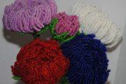 Далее, готовим длинный отрезок проволоки приблизительно 1,2 метра длиной и делаем на нем тридцать две петли из белого бисера, каждая из которых состоит из двадцати трех бисеринок. Созданные петельки, прикручиваем около сердцевины, начиная с малых (из 23 бисерин), заканчивая большими (из 32 бисерин). Далее, используя еще один отрезок проволочки, дополнительно скрепляем присоединенные лепесточки.