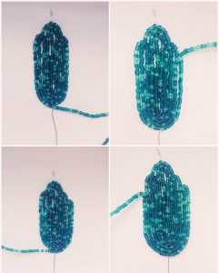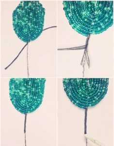 В следующем этапе мастер-класса будет показано, как плести листья. Смешайте в одной емкости зеленый и светло-зеленый бисер и отрежьте основной материал протяженностью сто тридцать сантиметров. Сформируйте ось и на нее наберите 29 бусин. Сделайте петлю, а потом на один край нанизывайте восемьдесят сантиметров бисерочка. Теперь задача заключается в том, чтобы выполнять плотно прилегающие бисерные полосы, как показано на фото. Весь пошаговый процесс вы можете посмотреть самостоятельно, в нем нет ничего сложного.
