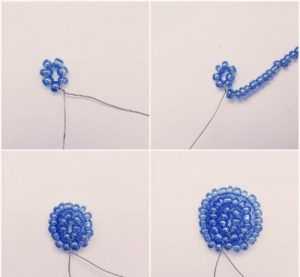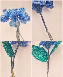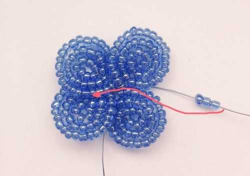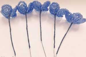 Начинаем плести сам цветок из синего бисера. Для этого понадобится 48 мелких бутонов, чтобы поделка имела натуральную пышную форму. Отрежьте шестьдесят сантиметров проволочки и наберите семь бисерин. Отступите от края 11 см и скрутите петлю так, как изображено на фото. Затем расположите следующий бисерный ряд так, чтобы он как можно плотнее прилегал к предыдущей полосе. Далее продолжайте плетение таким же образом. Теперь у вас получился первый лепесточек будущего бутона. Отступите от первой заготовки один сантиметр и сделайте петлю из семи бусин. Вам нужно повторить все действия по аналогии, как было описано выше. Бутончик будет состоять из четырех лепестков.