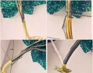 Соберите сперва бутоны из бисера вместе, сформировав букетик. Обмотайте его проволокой и нитками, а потом добавьте листву, как на фото. Все ветки приматывайте друг к другу и у вас в итоге должен получиться куст.