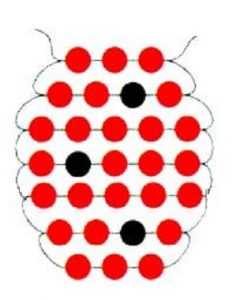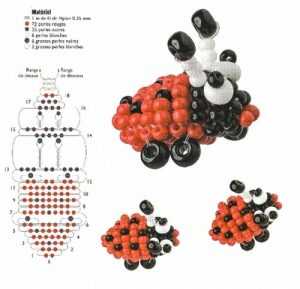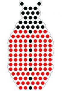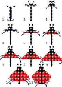 Следующее плетение будет происходить аналогично. Чередуйте сочетание цветовых элементов согласно схемы, которая будет продемонстрирована в статье. Продолжайте мастерить насекомое до тех пор, пока со всех сторон не останется по шесть бусин. Новый ряд следует плести без прибавок новых элементов. Только после этого можете приступать к уменьшению бисерин в поделке. В каждом новом ряду на одну бусину должно быть меньше до тех пор, пока не останется всего пять элементов. Проволочку подтяните и ведите ее сквозь верхние полосы. Затем закрепите ее, а лишнее срежьте ножничками. Оставшиеся края спрячьте между другими рядами, как изображено на рисунке. Чтобы поделка была устойчивой, вы можете дополнительно сплести еще и лапки, точно также, как усы. Вот и все, бисероплетение «божьего» насекомого закончено. А вы можете продолжать развивать свои навыки, с помощью создания других простых фигурок.